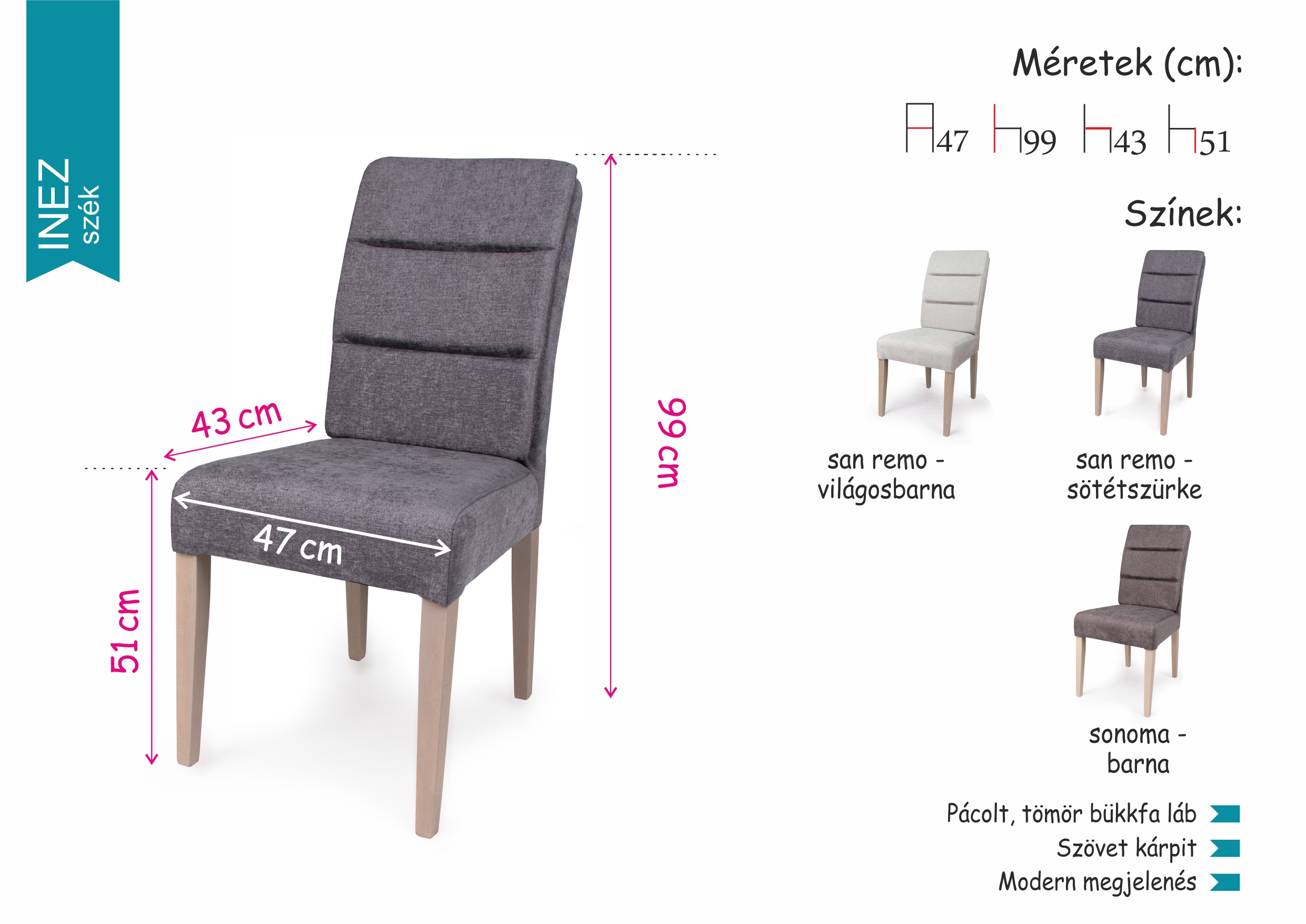 | Szín | San remo – világosbarna, San remo – sötétszürke, Sonoma – barna |
