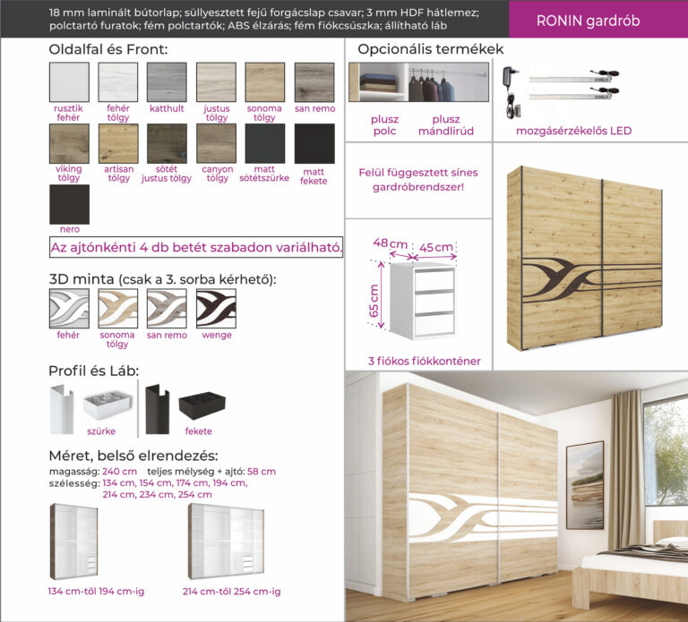 | Megjegyzés: | A Ronin gardrób ajtói 4-4 panelből állnak, melyek színei szabadon választhatóak. Mind a panelek, mind az oldalfal 13-féle színben kérhető, | ||